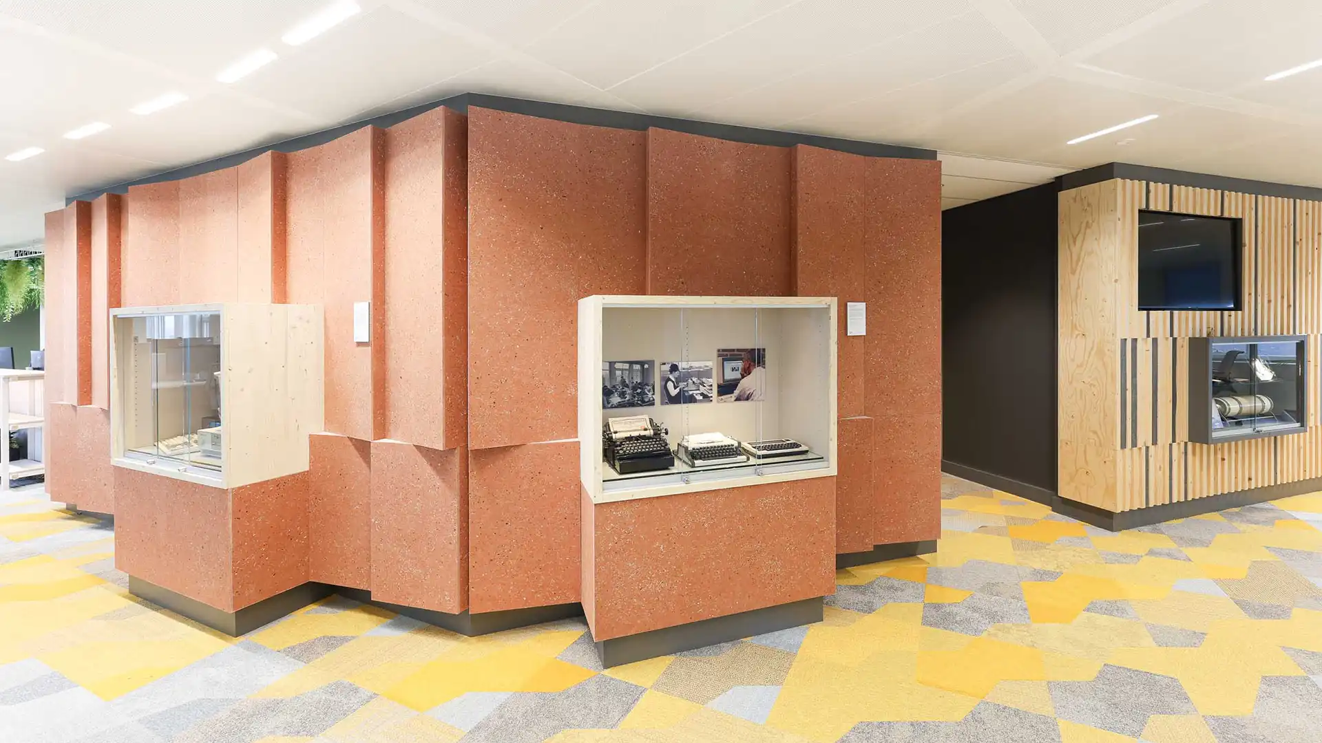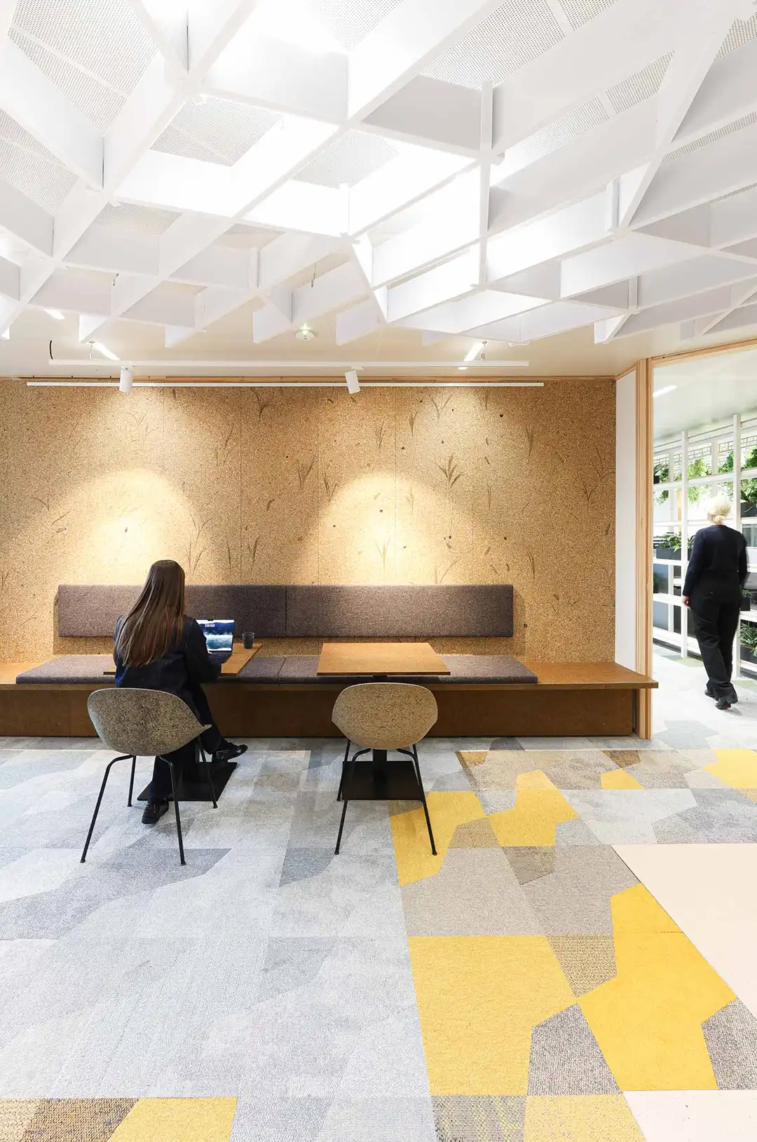 "Lounge areas with sustainable walls, ceilings, carpet tiles and furniture"