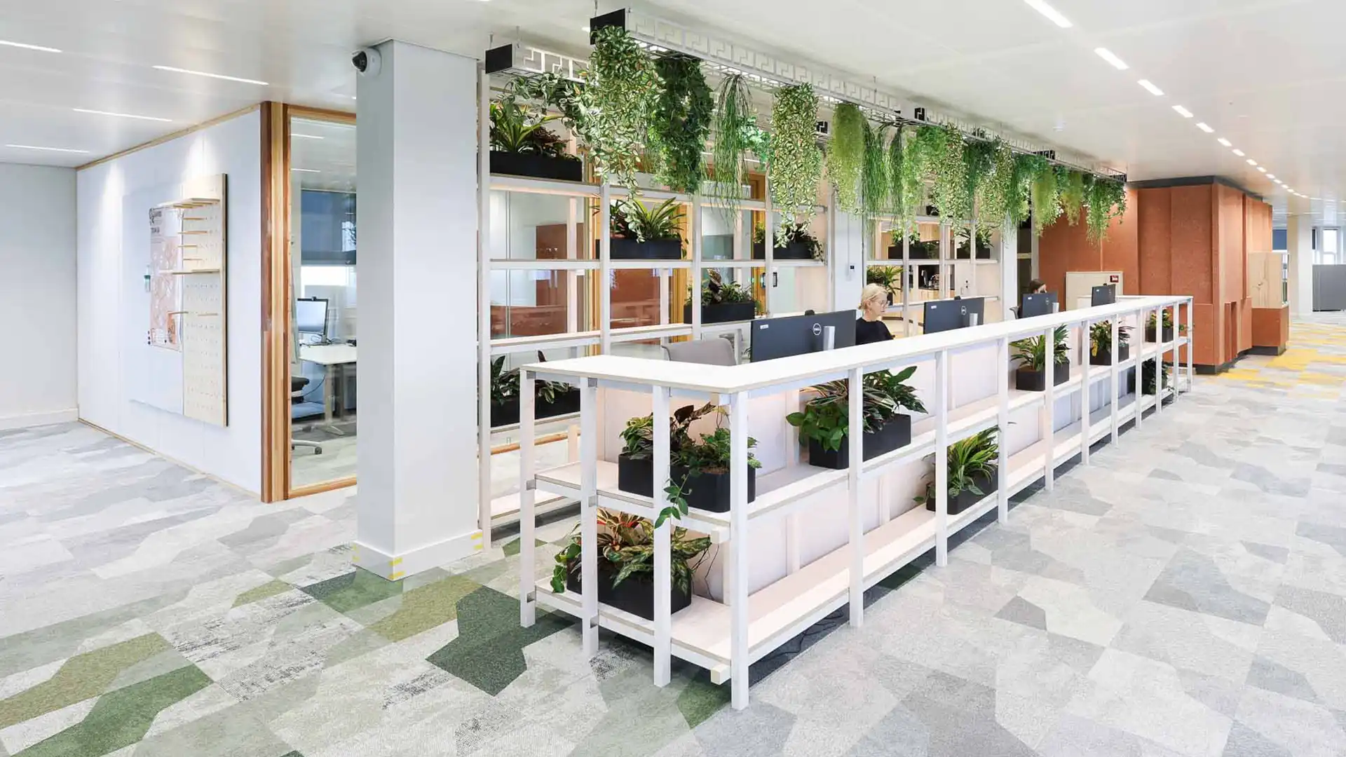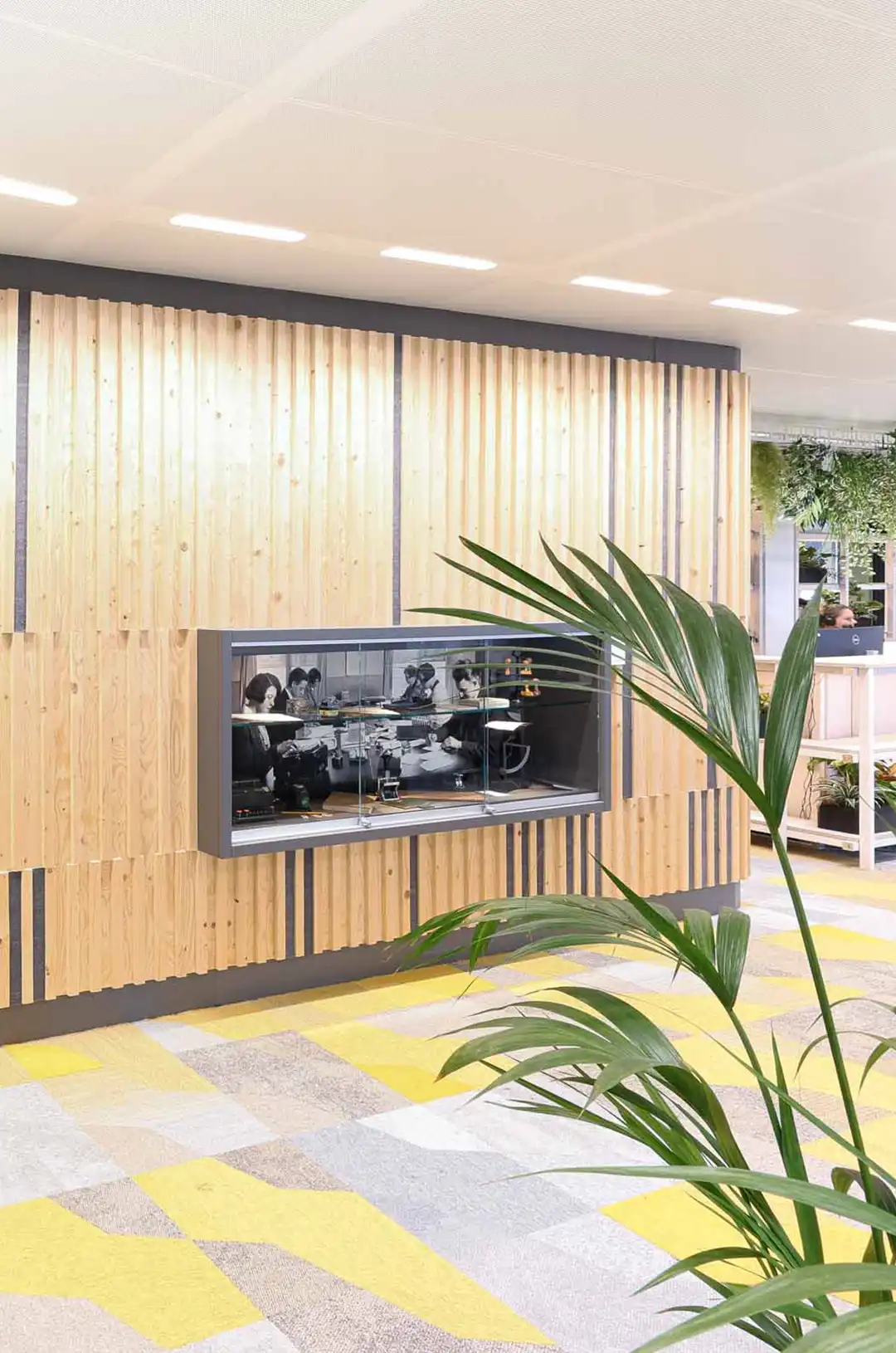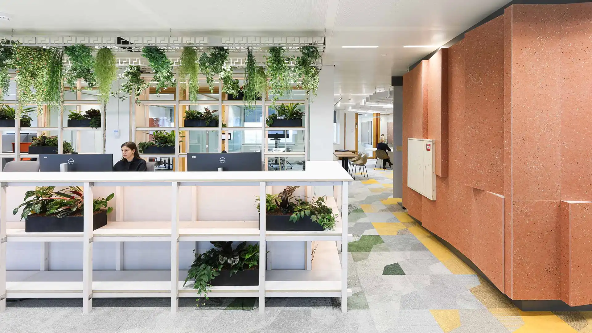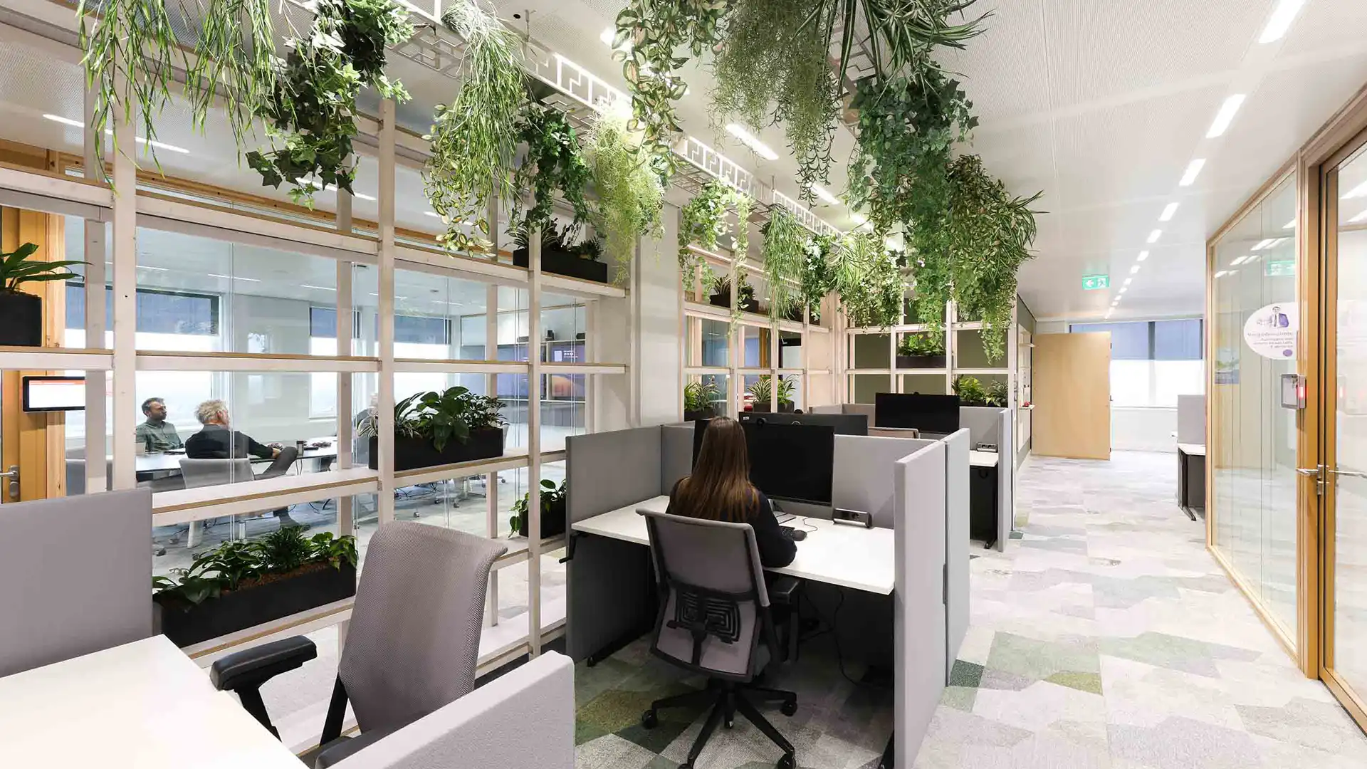 Green is an integral part of the design. Plant stages and green frameworks around workplaces strengthen the connection with nature. These frameworks are made from recycled wooden slats and connect identity, circularity and well-being.